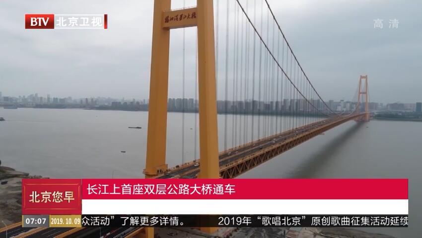 在宽度超过1500米的长江武汉段江面,一座“身披”金秋黄的大型悬索桥一跨过江,犹如金色巨龙卧伏江面。这座武汉杨泗港长江大桥8日通车,标志着长江上首座双层公路大桥正式投入使用。