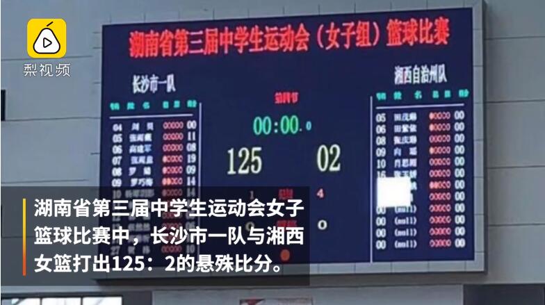 2019年10月28日,湖南省第三届中学生运动会女子篮球比赛在岳阳结束,其中长沙市一队与湘西女篮的小组赛打出125:2的悬殊比分。竞赛组组长表示,湘西女篮是基层队伍,没有经过专业训练,可能是悬殊比分的原因之一。