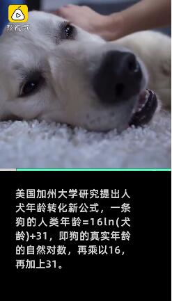 据《科学预警》杂志11月18日报道,美国加州大学研究提出人犬年龄转化新公式,一条狗的人类年龄=16ln(犬龄)+31,即狗的真实年龄的自然对数,再乘以16,再加上31。7周大的狗狗相当于9个月大的婴儿,两者都刚开始长牙。