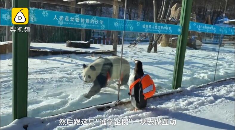 2019年12月1日,黑龙江哈尔滨,一只企鹅坐火车从哈尔滨赶往某景区见大熊猫。火车特地为企鹅开辟了一块私人空间,并将温度调至零到五度。到了熊猫馆后,企鹅特别兴奋来回踱步,但大熊猫进食完了才慢慢来和企鹅玩儿。