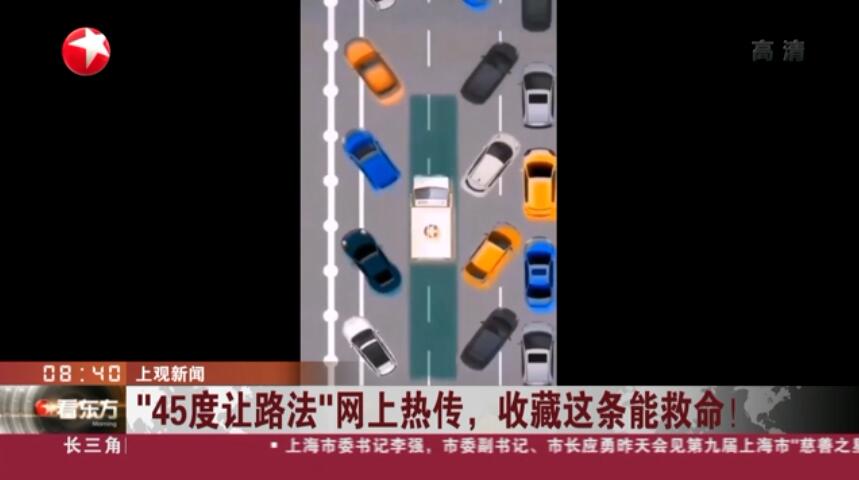 在一段动画模拟视频中,一条三车道的路上出现排队拥堵的状况,而后方则有一辆拉响警报的救护车需要紧急运送病人上前。为了让救护车尽快通过拥堵路段,所有车辆都分别向自己左右前方45度角侧身转向,为急救车让出了一条狭窄的“生命通道”。