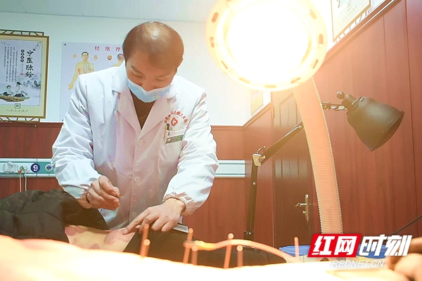 在卫生院的中医理疗室,朱炳栋在为病人扎银针。