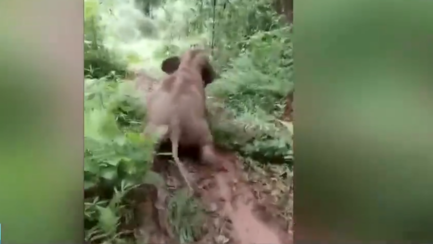 西双版纳亚洲象救护与繁育中心救助的幼象“龙龙”,脚部曾受伤。近日的野化训练中,它起初对陡坡有些害怕,下坡连走带滑;之后找到诀窍,爬回山坡,肚皮贴地又滑了一遍↓饲养员介绍,这种“滑滑梯”的动作,是亚洲象在湿滑地面的相对安全的下山方法。