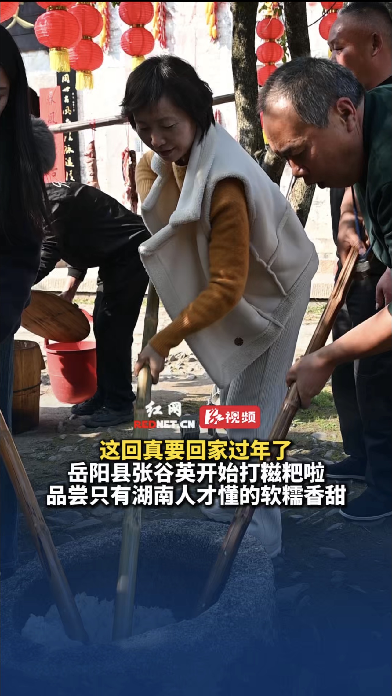 红网时刻新闻1月15日岳阳讯(记者 韩佳根 实习生 刘雨欣)1月15日,岳阳县张谷英村陆续开始进行杀年猪、做油豆腐、烫绿豆粉皮、打糍粑等活动,以迎接春节的到来。糍粑是用糯米蒸熟捣烂后所制成的一种食品。是通过把熟糯米饭放到石槽里用石锤或者芦竹捣成泥状制作而成,在中国南方尤其是湖南地区较为流行。