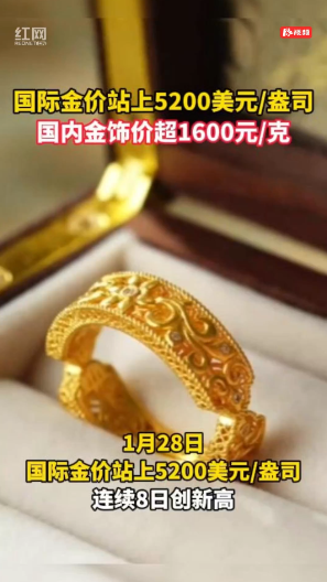 红网时刻新闻1月28日讯(记者 郭雅倩 吴芳 实习生 李雨欣)1月28日,国际金价再创新高,站上5200美元/盎司。红网时刻新闻记者查阅,国际金价已连续8日创新高,从2026年首个交易日的4331.59美元/盎司,涨至5217.18美元/盎司(1月28日上午10点30分左右),不到一个月,涨幅已超20%。国内品牌金饰跟涨,根据金投网数据,老凤祥单日大幅上涨44元/克,最新报价为1620元/克,周大福、老庙黄金最新报价为1618元/克,周生生报价1614元/克。多家品牌金饰价单日涨幅超2%。