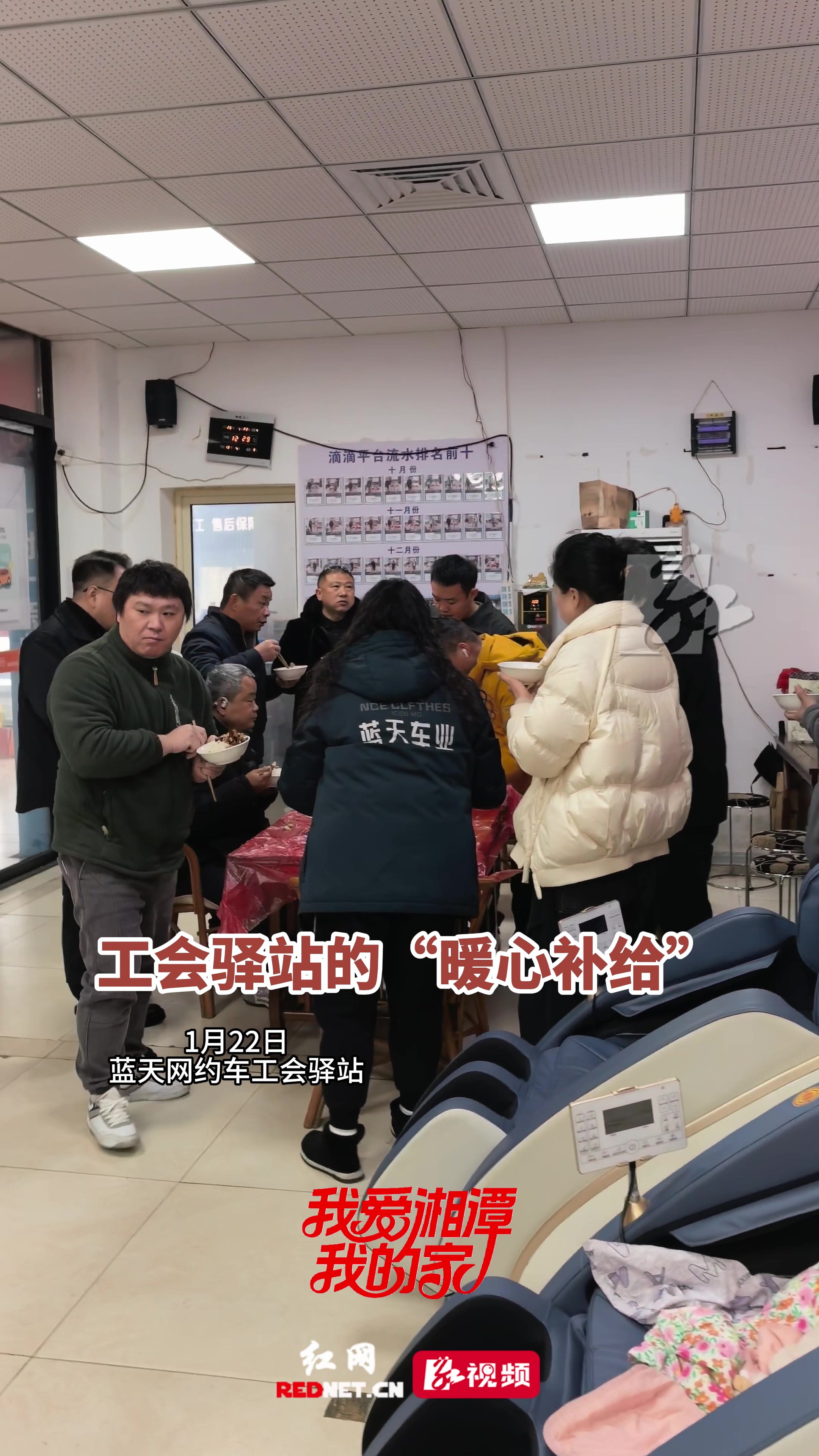 1月22日中午,湘潭街头冰雪还没化,天冷得很,但是雨湖区蓝天网约车工会驿站里却暖和和的。十多位网约车司机聚在一块,吃着免费的热乎饭菜,有说有笑。