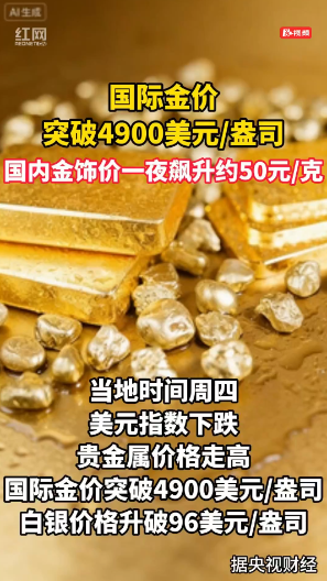 红网时刻新闻1月23日讯(记者 吴芳 郭雅倩 实习生 李雨欣)1月22日,国际金价突破4900美元/盎司关口,再创历史新高!