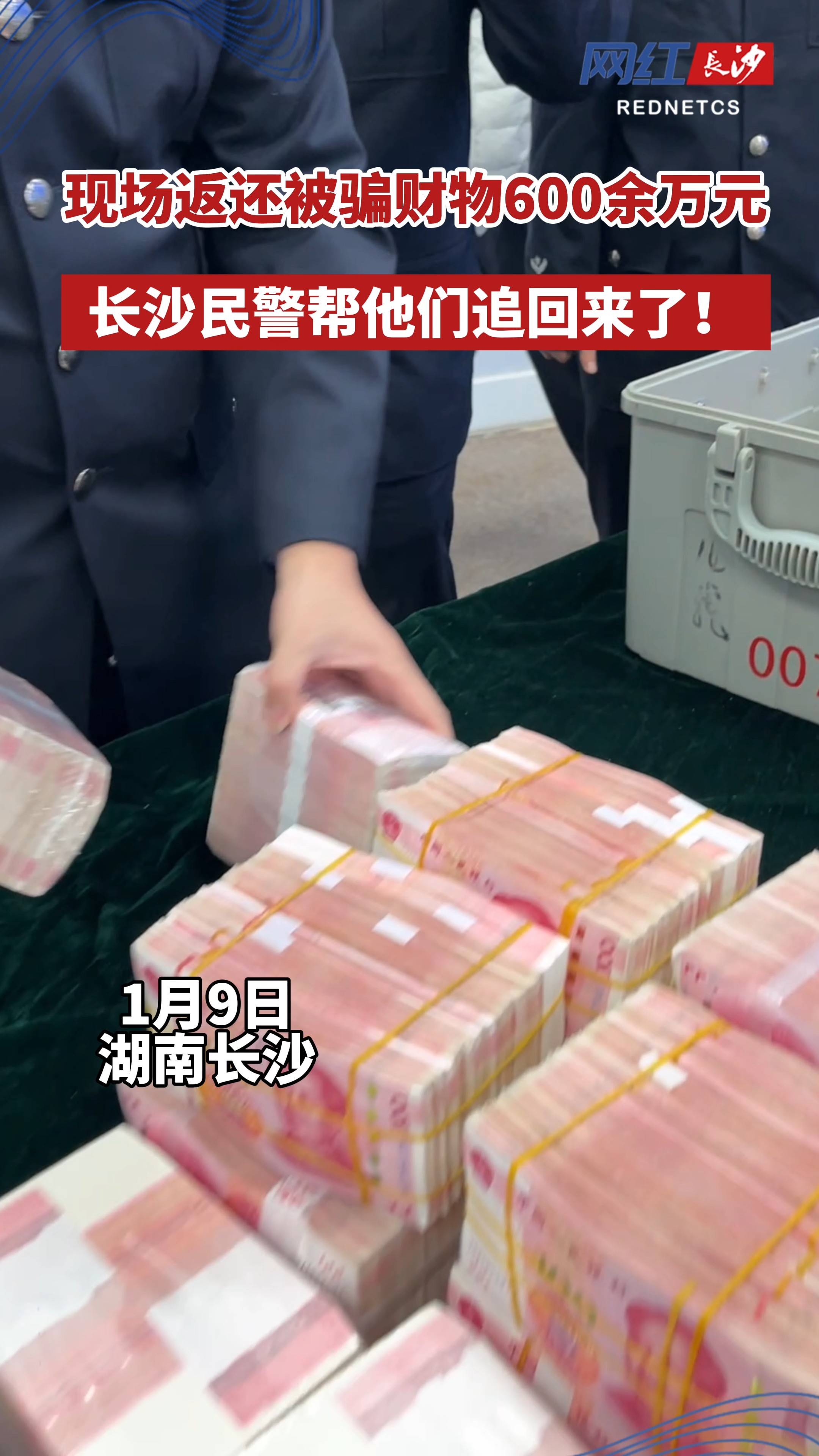 红网时刻新闻1月9日讯(记者 余雅琴 蒋雨岑)1月9日,长沙市公安局举行电信网络诈骗案件被骗资金集中返还仪式,共向12名受害群众返还被骗财物600余万元。提醒大家,天上不会掉馅饼,生活处处是陷阱,擦亮眼睛,护好自己的钱袋子!