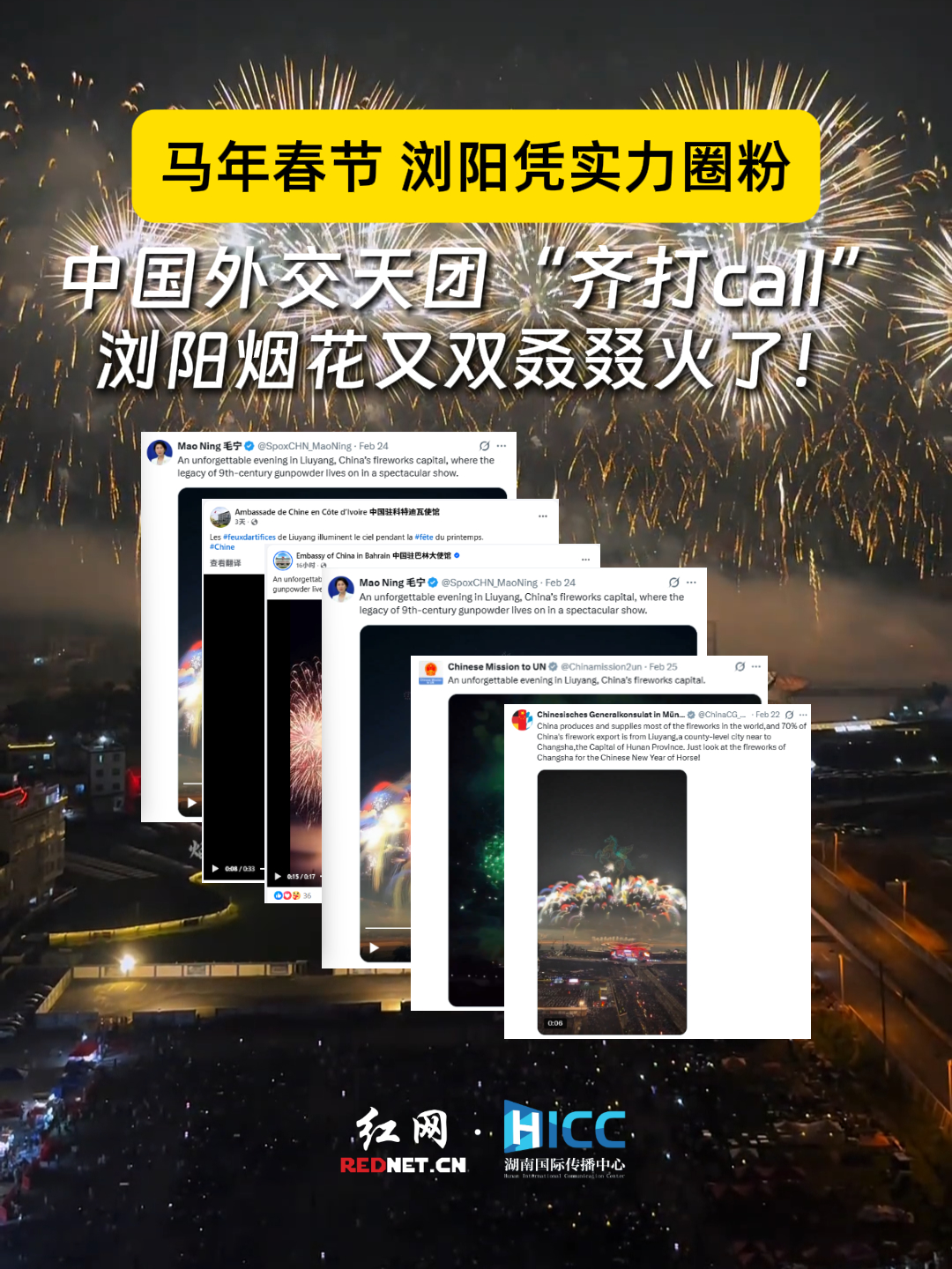 这个春节,浏阳烟花再次惊艳世界!中国常驻联合国代表团,中国驻慕尼黑总领馆、中国驻巴林大使馆、中国驻科特迪瓦大使馆、中国驻斐济大使馆、外交部发言人毛宁、中国驻巴基斯坦文化参赞张和清等,纷纷通过海外社交媒体账号向世界推荐湖南烟花,点赞这份来自中国的年味与浪漫。