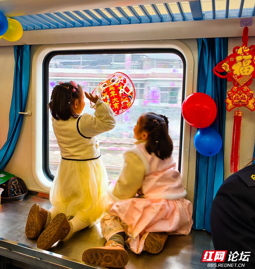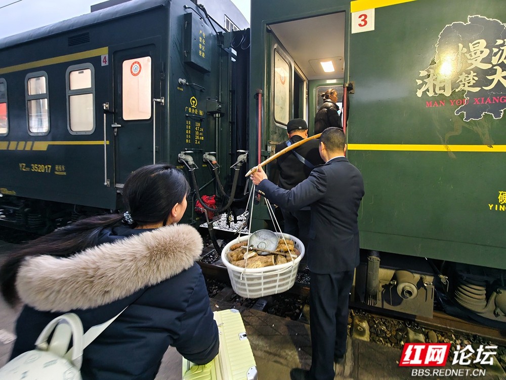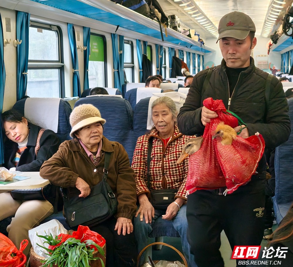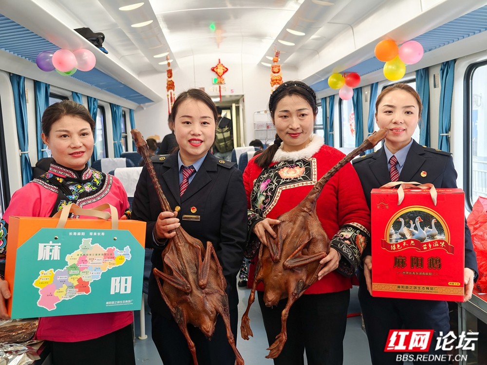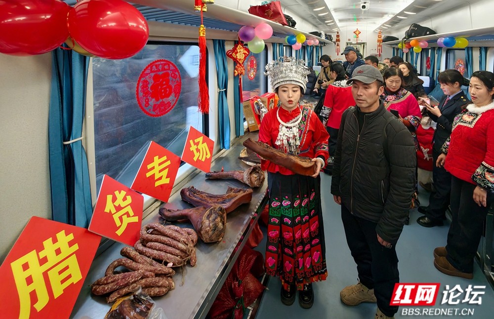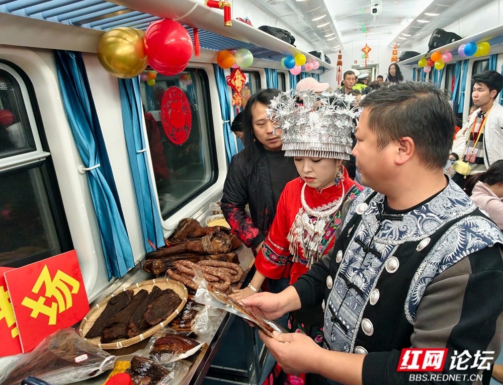 车厢内,火红的灯笼、绚丽的气球与窗贴上的“福”字交织出浓浓的年味。身着制服的铁路工作人员化身“带货达人”,架起手机支架,在镜头前为家乡的腊肉、香肠和麻阳鹅热情助阵;身着民族盛装的姑娘们笑意盈盈,向旅客展示着最地道的湘西风味。这里的空气中弥漫着烟火气,背篓里装着新鲜的蔬菜,编织袋里透出家禽的啼鸣。