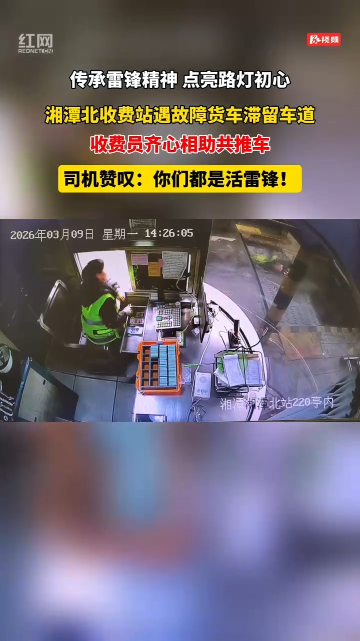 3月9日下午,一辆小货车行驶至湘潭北收费站出口突发故障——燃油耗尽,刚好停在车道里。当班收费员赶紧上前问情况,迅速组织人员合力推车。大家齐心协力、配合默契,将故障车辆安全推至广场安全区域,并为驾驶员提供修车工具,给予支援帮助。驾驶员连声道谢道:“你们真是活雷锋!”