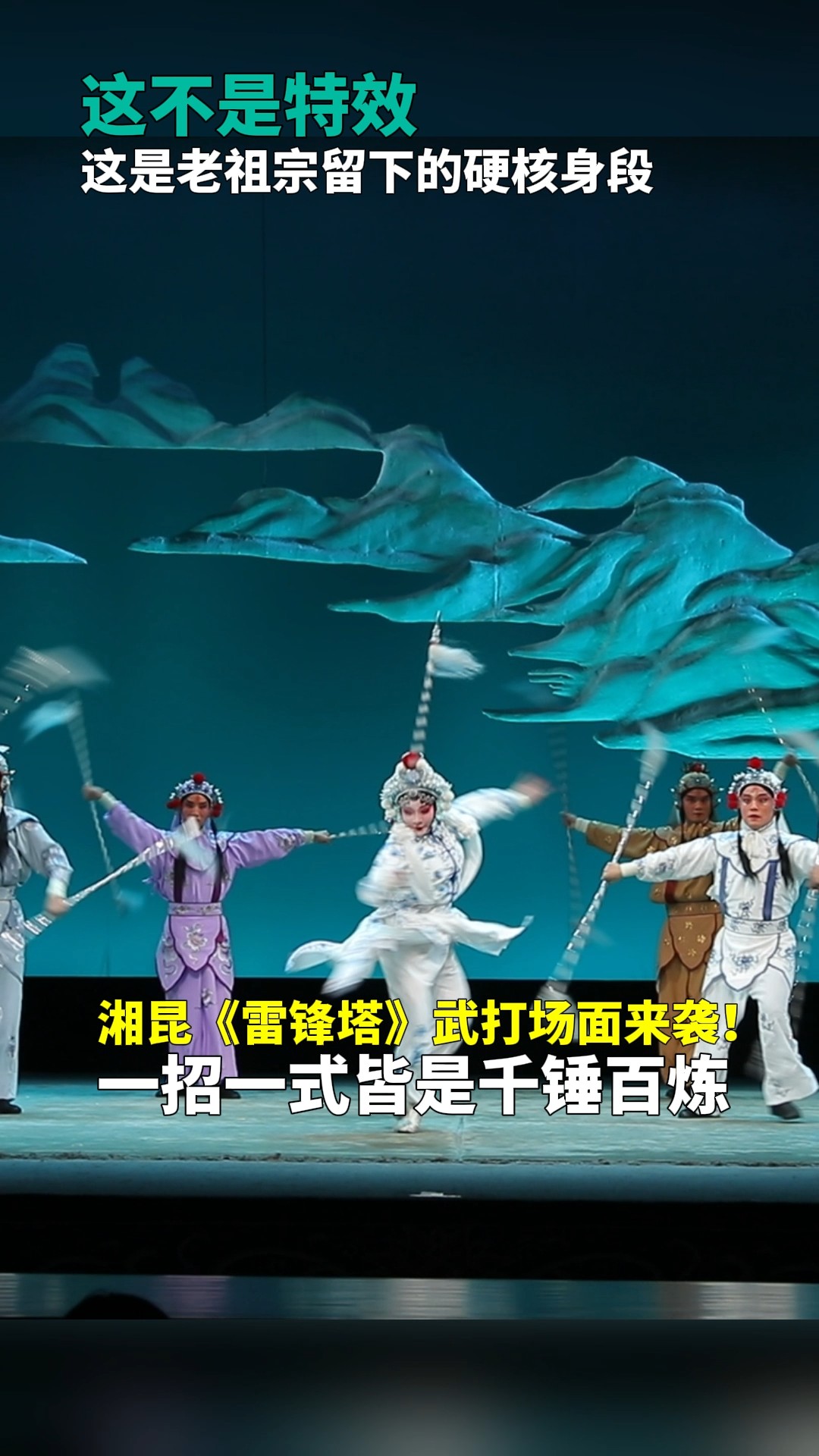 湘昆以“重大本、重武戏、重民间”为传统,这一特质在全本《雷峰塔》中被推向极致。白素贞的文戏段落温婉缠绵,水袖轻扬间尽是儿女情长;武戏场面则凌厉如风,踢出手、高台钓鱼、把子翻身等高难度特技轮番上演,将湘昆武戏的力量感拉满。