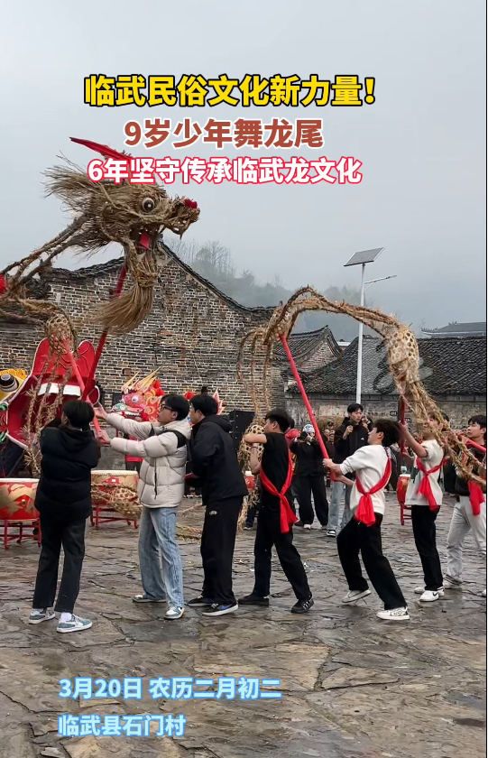 3月20日农历二月初二,临武县花塘乡石门村“二月二”龙抬头民俗文化活动现场锣鼓喧天,彩龙起舞。舜峰镇石家村9岁的石俊祥手握龙尾杆,跟着鼓点灵活腾挪,龙尾在他手中时而摆尾回旋,时而凌空翻跃,动作娴熟利落,成为现场备受瞩目的焦点。