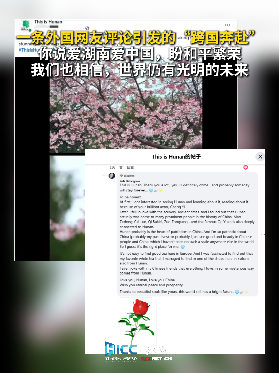 红网时刻新闻3月4日讯(记者 谭苏昕 朱丽萍 廖洁)“ I'm so patriotic about China ,probably I just see good and beauty in Chinese people.Love you, Hunan, Love you, China...Wish you eternal peace and prosperity.(我对中国充满好感,也许是因为我在中国人民身上看到了善良与美好。爱你,湖南;爱你,中国。希望一切和平繁荣。)”