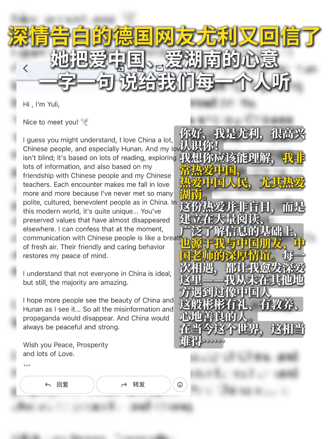 3月5日,深情告白湖南的德国波茨坦网友尤利再次给我们回信,吐露她热爱中国、热爱湖南的心意。她说,她的热爱并非盲目,源于阅读,也源于中国朋友的深厚情谊。她从未在其他地方遇到这么多心地善良的人。希望更多人像她一样,看到中国和湖南的美好。