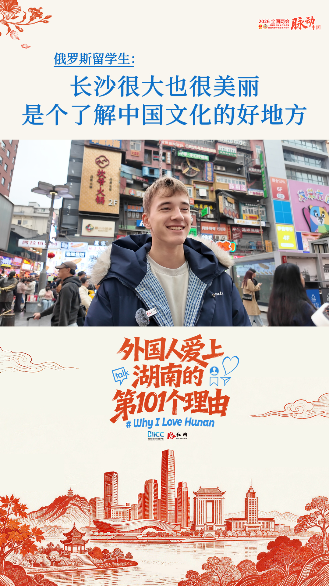 全国两会期间,湖南国际传播中心、红网策划推出《外国人爱上湖南的第101个理由》。第三期听俄罗斯留学生讲述他眼中的湖南长沙。在他看来,长沙不仅城市规划有序、环境舒适,还有各种各样的活动可以参与,生活气息十足。闲暇时走进长沙各大风景秀丽的景区,更让他感受到这座城市的自然之美与人文气息。“这里真的很美,”他笑着说,“而且也是一个了解中国文化的好地方,我一定会推荐朋友们来看看。”