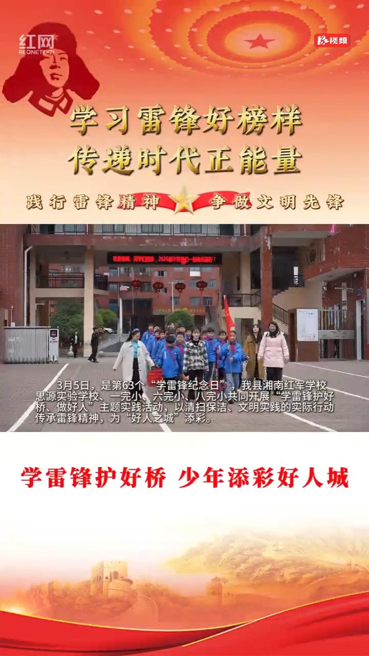 红网时刻新闻3月6日郴州讯(通讯员 邓文超 彭烨 杨玲静)3月5日,在第63个“学雷锋纪念日”当天,宜章县湘南红军学校、思源实验学校、六完小、八完小、一完小共同开展“学雷锋、护好桥、做好人”主题实践活动,百余名少先队员走出校园来到“好人桥”,以清扫保洁、文明实践的实际行动,传承雷锋精神,为“好人之城”添彩。