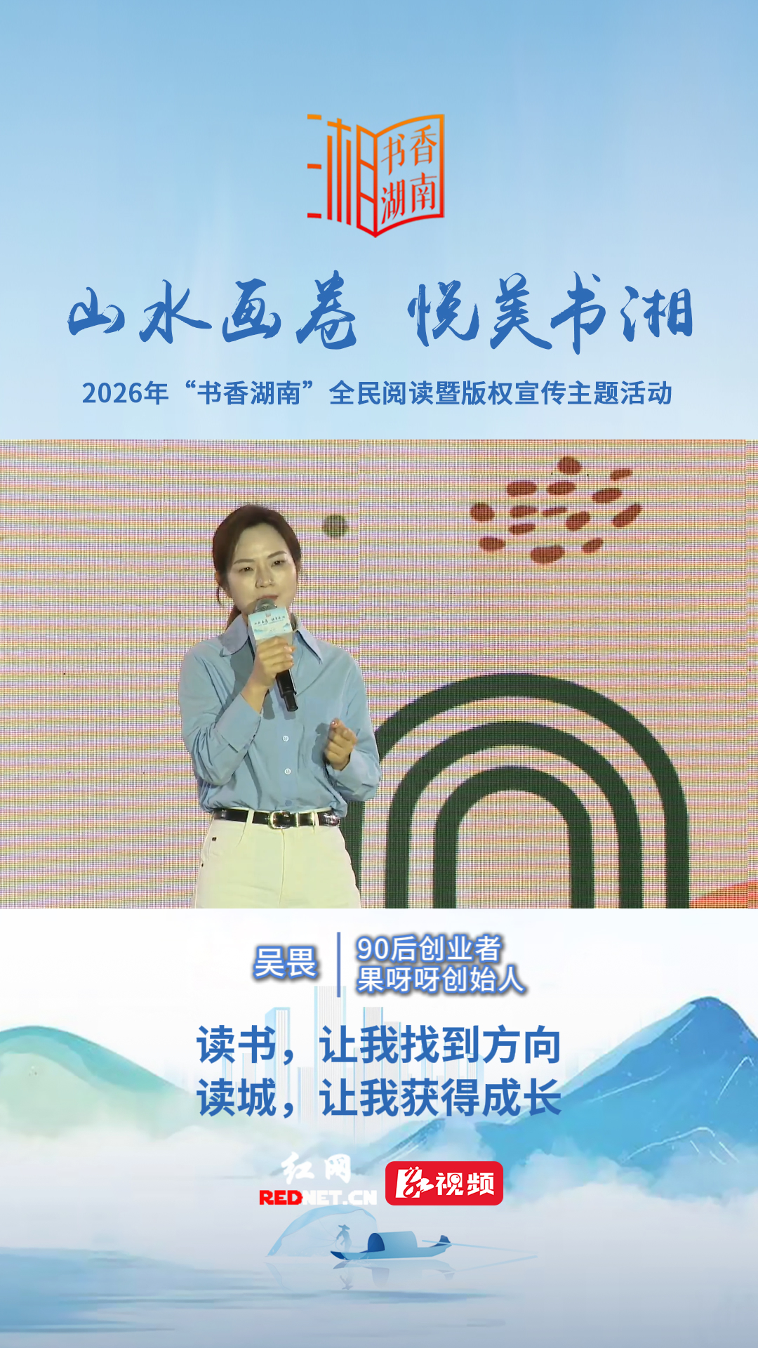 红网时刻新闻记者 任晔 刘明珠 向玮 龚晗 郴州报道4月15日,在2026年“书香湖南”全民阅读暨版权宣传主题活动上,90后创业者、果呀呀创始人吴畏分享了自己从一杯果茶出发,在阅读中读懂城市,把一份小小的喜欢,做成点亮城市的甜蜜事业的故事。她说:其实阅读不是读一本书,更是要读生活、读懂人心,读懂城市。读书,会让我在迷茫的时候,找到一些方向,读城市会让我在奋斗中获得该有的成长。