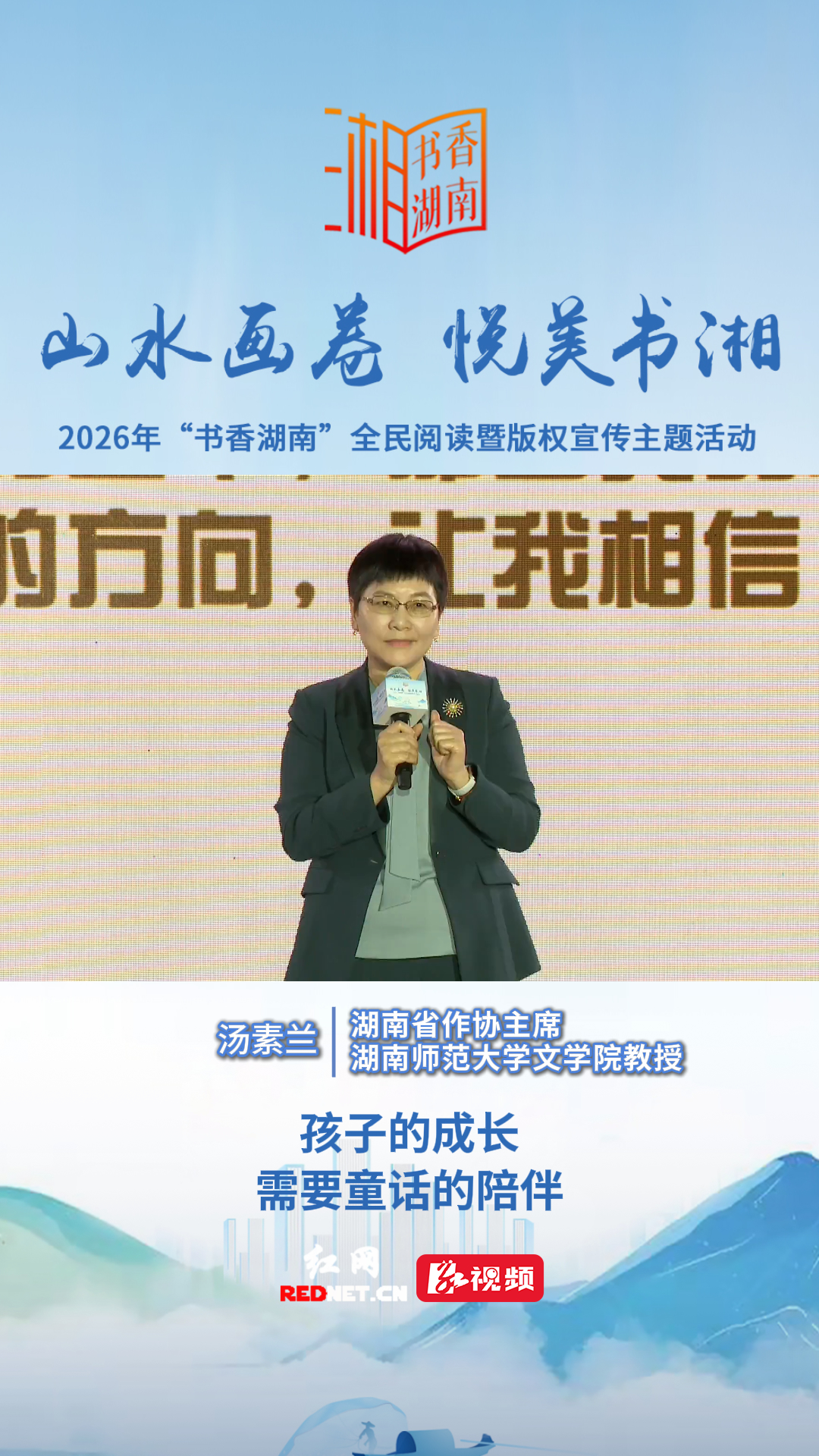 红网时刻新闻记者 任晔 向玮 严若鹏 郴州报道4月15日,2026年“书香湖南”全民阅读暨版权宣传主题活动在郴州举行。湖南省作协主席、湖南师范大学文学院教授汤素兰作题为《在童话里,陪孩子慢慢成长》的分享,她在发言中动情地说:如果说,我曾用童话里的光温暖和照亮过孩子们的童年,那么我的小读者和长大了的他们,早已经成为了我生命里的光,指引着我前进的方向。让我相信,因为写作儿童文学,我是一个最幸福的人。