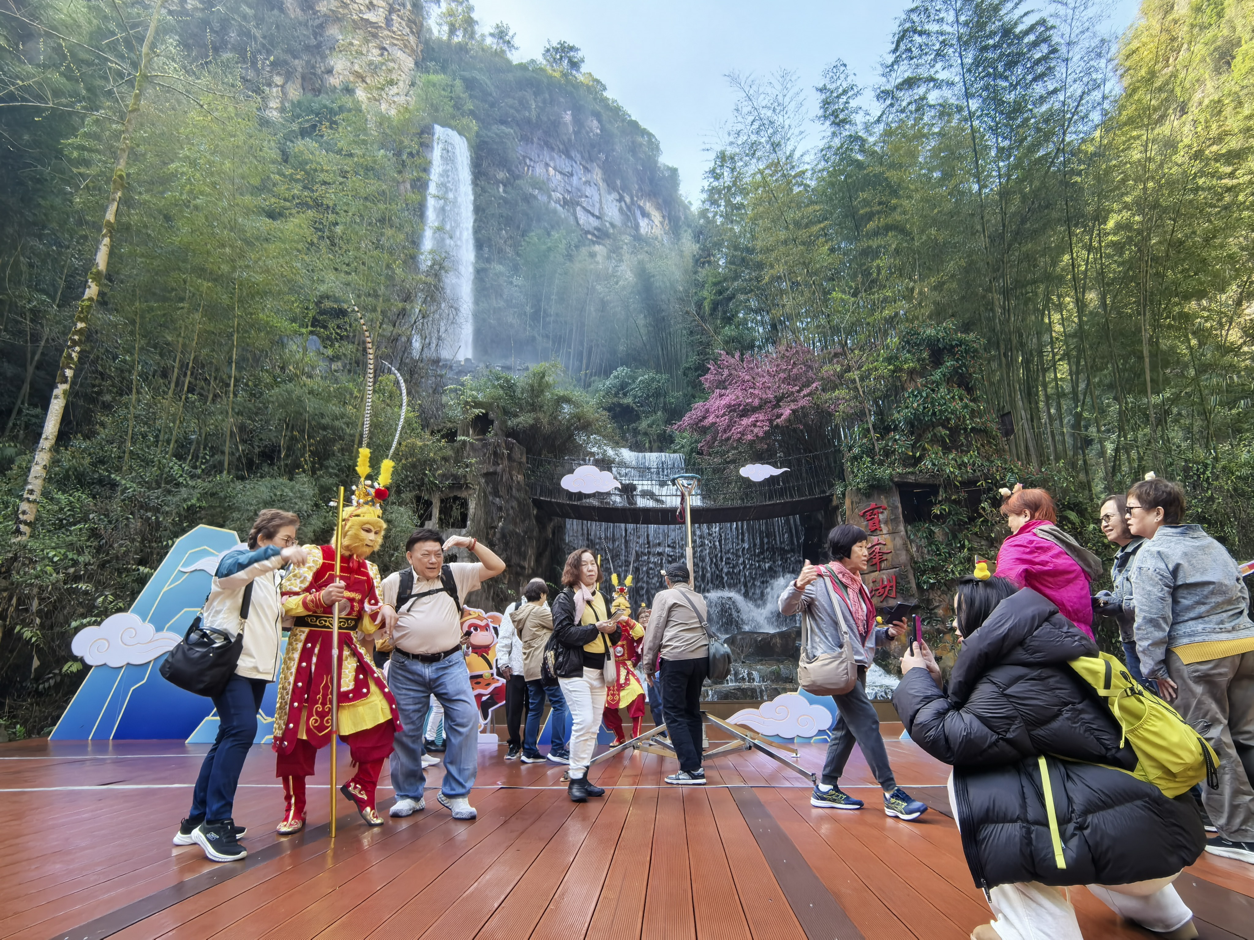 活动现场选址宝峰湖标志性瀑布景观前,青山为幕,飞瀑作伴,氛围感拉满。两位身着经典美猴王服饰的演员,凭借惟妙惟肖的神态、灵动矫健的身手,完美复刻《西游记》“真假美猴王” 经典桥段。金箍棒挥舞间,猴戏表演活灵活现,一招一式尽显猴王风采,引得现场游客阵阵欢呼、掌声不断。不少游客纷纷上前与“美猴王”互动合影,摆出同款俏皮姿势,定格与西游 IP 同框的欢乐瞬间,现场欢声笑语此起彼伏,热闹非凡。