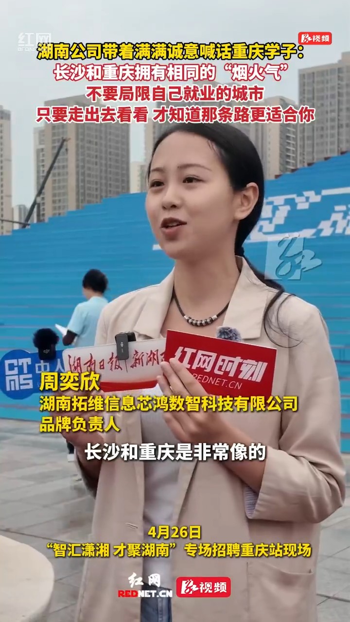 “长沙与重庆拥有相同的烟火气。”4月26日,在在“智汇潇湘 才聚湖南”行动重庆站的活动现场,湖南拓维信息芯鸿数智科技有限公司(以下简称“拓维信息”)品牌负责人周奕欣邀约重庆学子们来湖南就业、扎根。