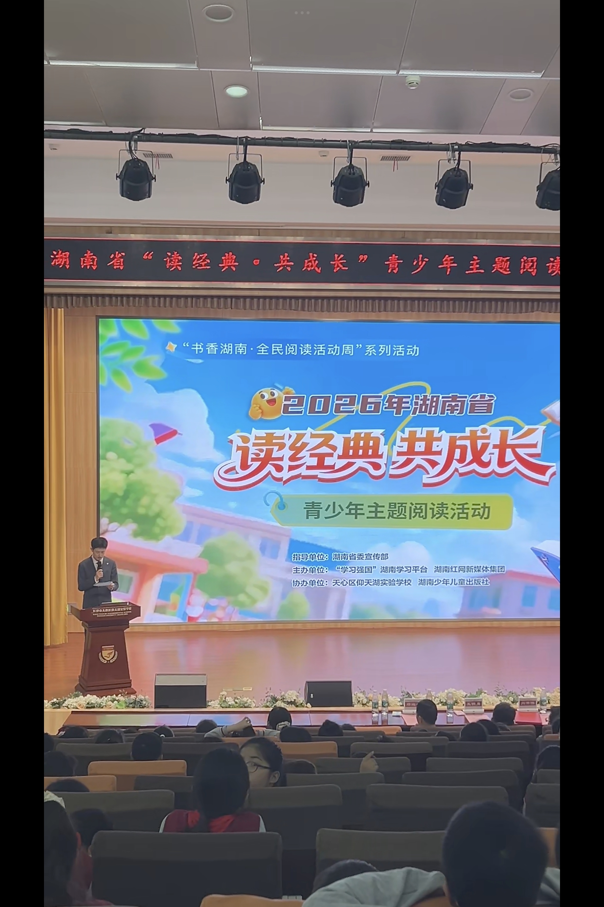 4月28日,2026年湖南省“读经典・共成长”青少年主题阅读活动首场校园专场在长沙市天心区仰天湖实验学校举行。