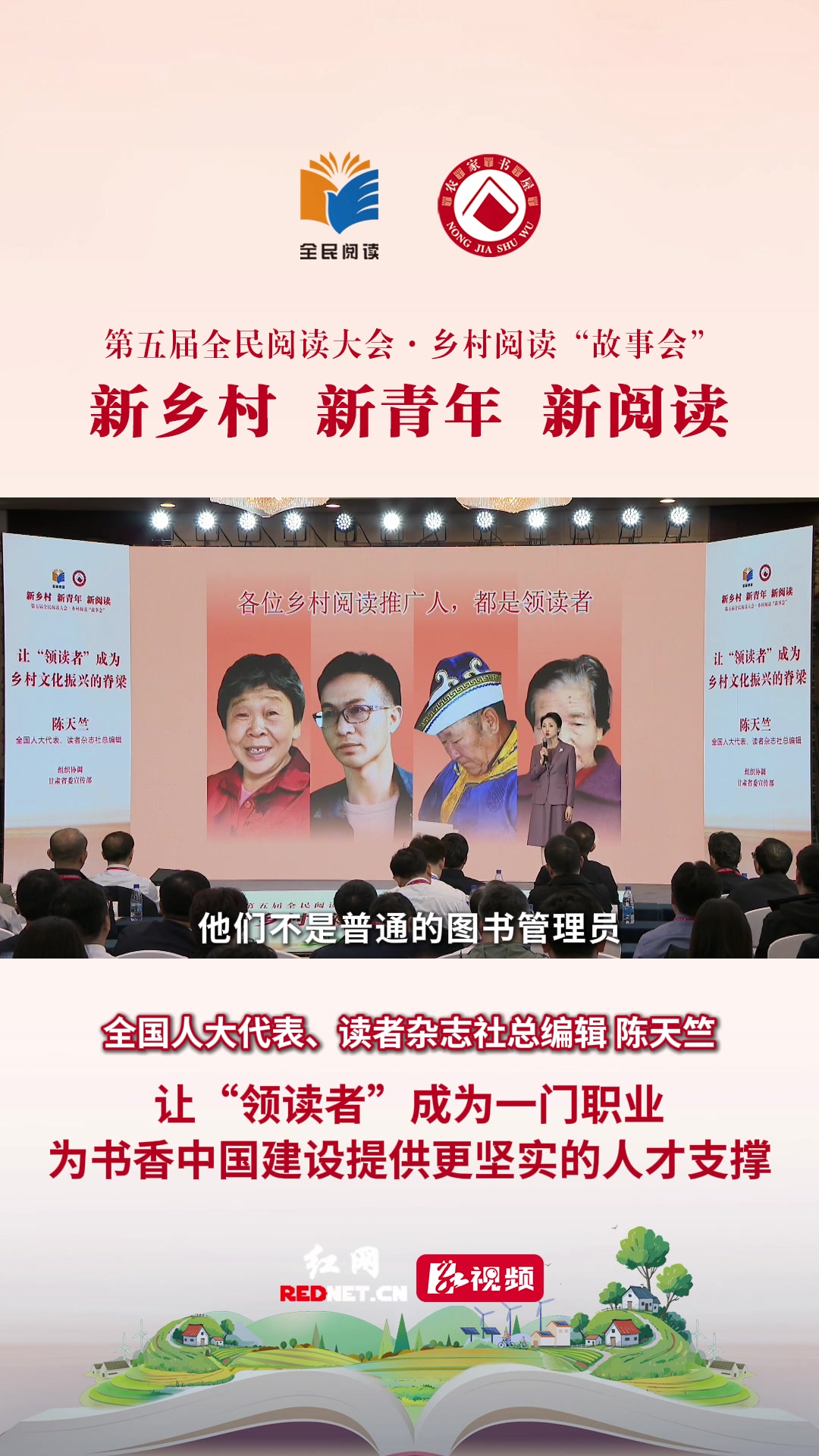 4月20日下午,第五届全民阅读大会·乡村阅读“故事会”在江西南昌启幕。这场以“新乡村 新青年 新阅读”为主题的活动,通过一个个沾泥土、带露珠的真实故事,勾勒出新时代乡村阅读的生动画卷。全国人大代表、读者杂志社总编辑陈天竺认为“领读者”不是普通的图书管理员,而是用书籍点燃希望的人。她希望让“领读者”成为一门职业,让专业的阅读推广工作有标准可依、有路径可循,让热爱阅读的人经过系统培训、获得社会认可,让书香中国建设拥有更坚实的人才支撑。
