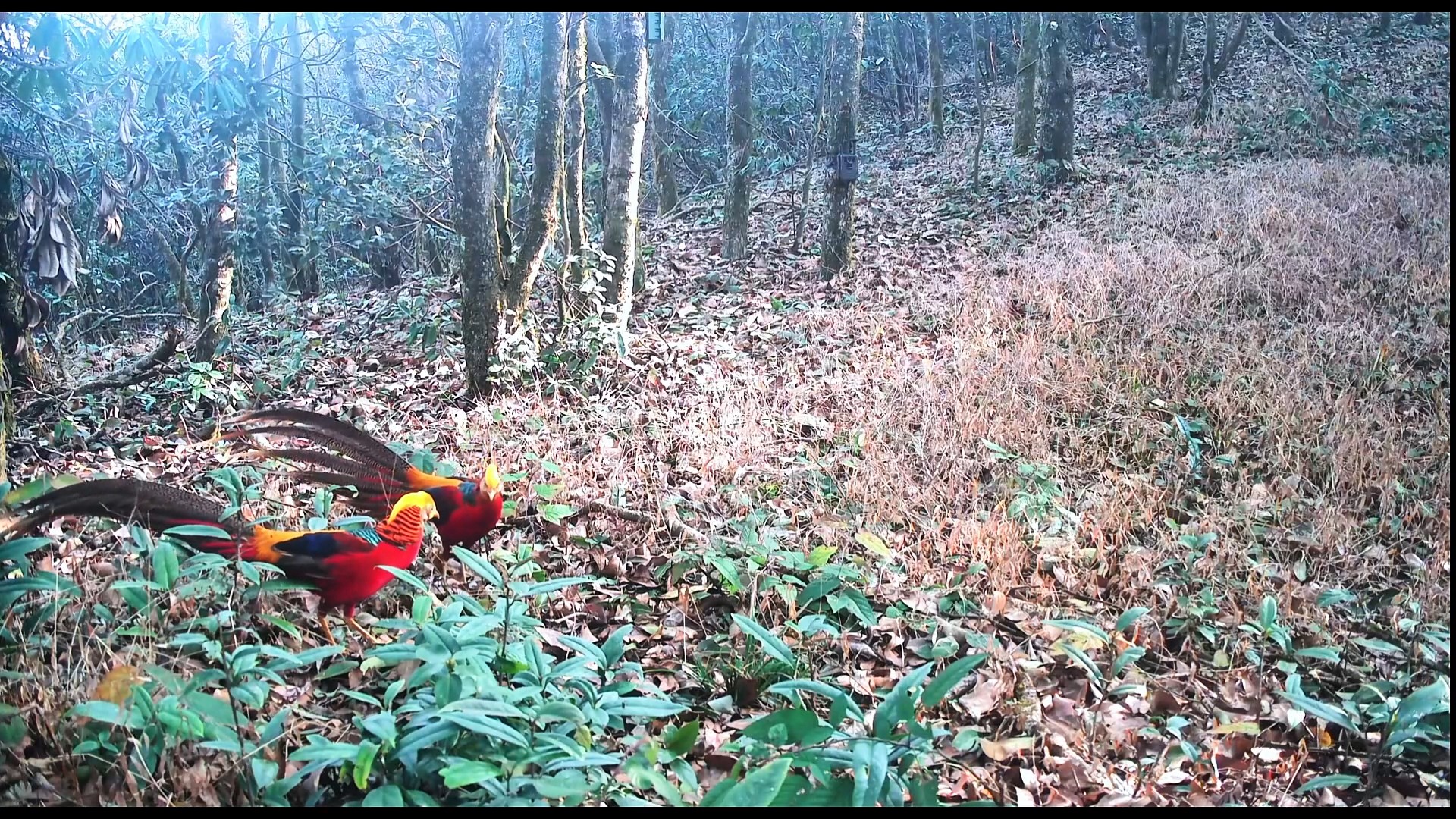 画面中,两只雄性红腹锦鸡身披华丽彩羽,头顶金黄羽冠傲然挺立,赤红腹部与斑斓长尾在林间格外醒目。它们时而昂首对峙、羽翼微张,时而扑腾跳跃、利爪相抵,动作敏捷有力,整个过程持续数分钟,被红外相机完整记录。