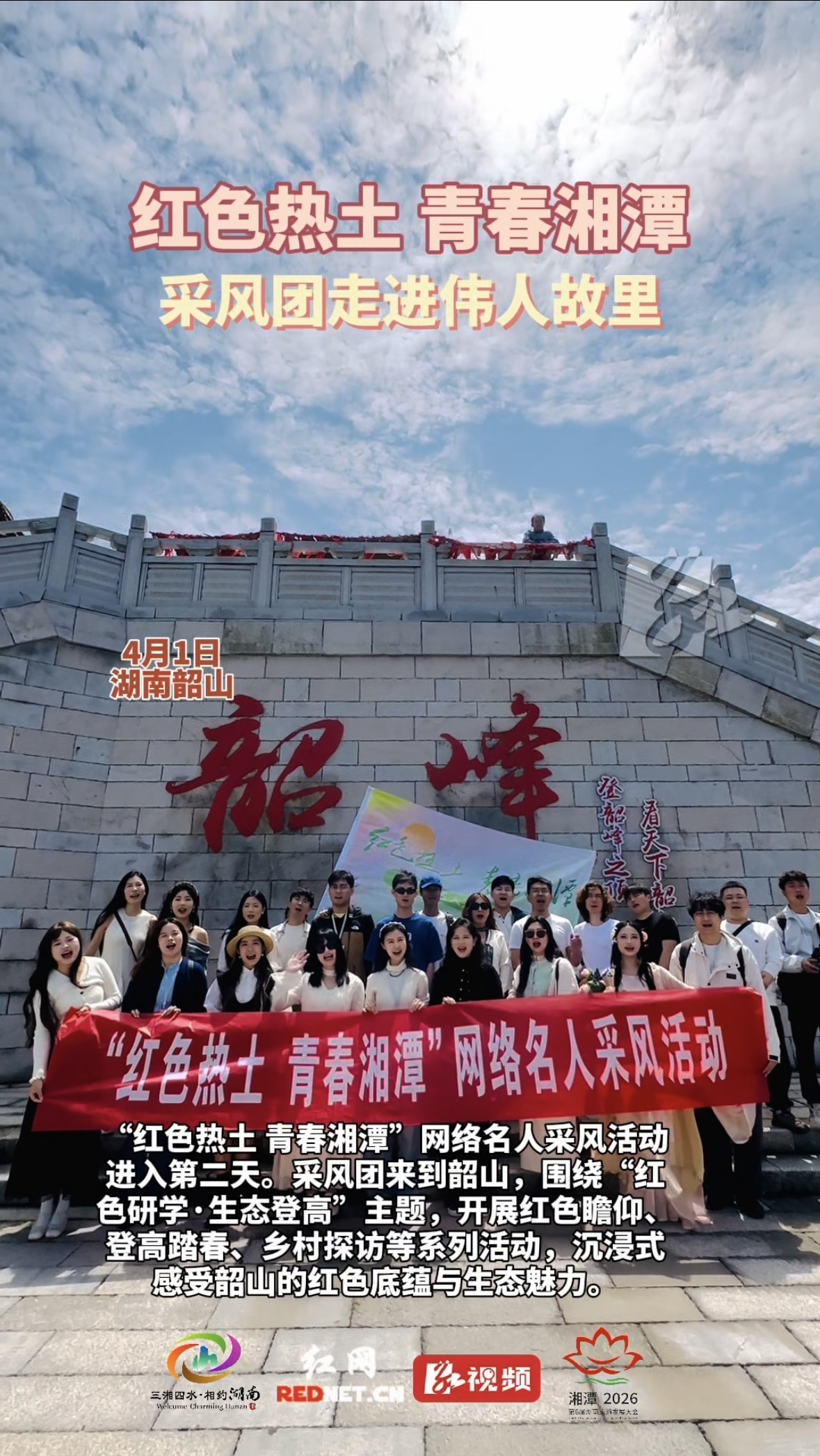红网时刻新闻4月1日湘潭讯(记者 李乐怡 实习生 言雨桐)4月1日,“红色热土 青春湘潭”网络名人采风活动进入第二天。当天,采风团来到韶山,围绕“红色研学·生态登高”主题,开展红色瞻仰、登高踏春、乡村探访等系列活动,沉浸式感受韶山的红色底蕴与生态魅力。
