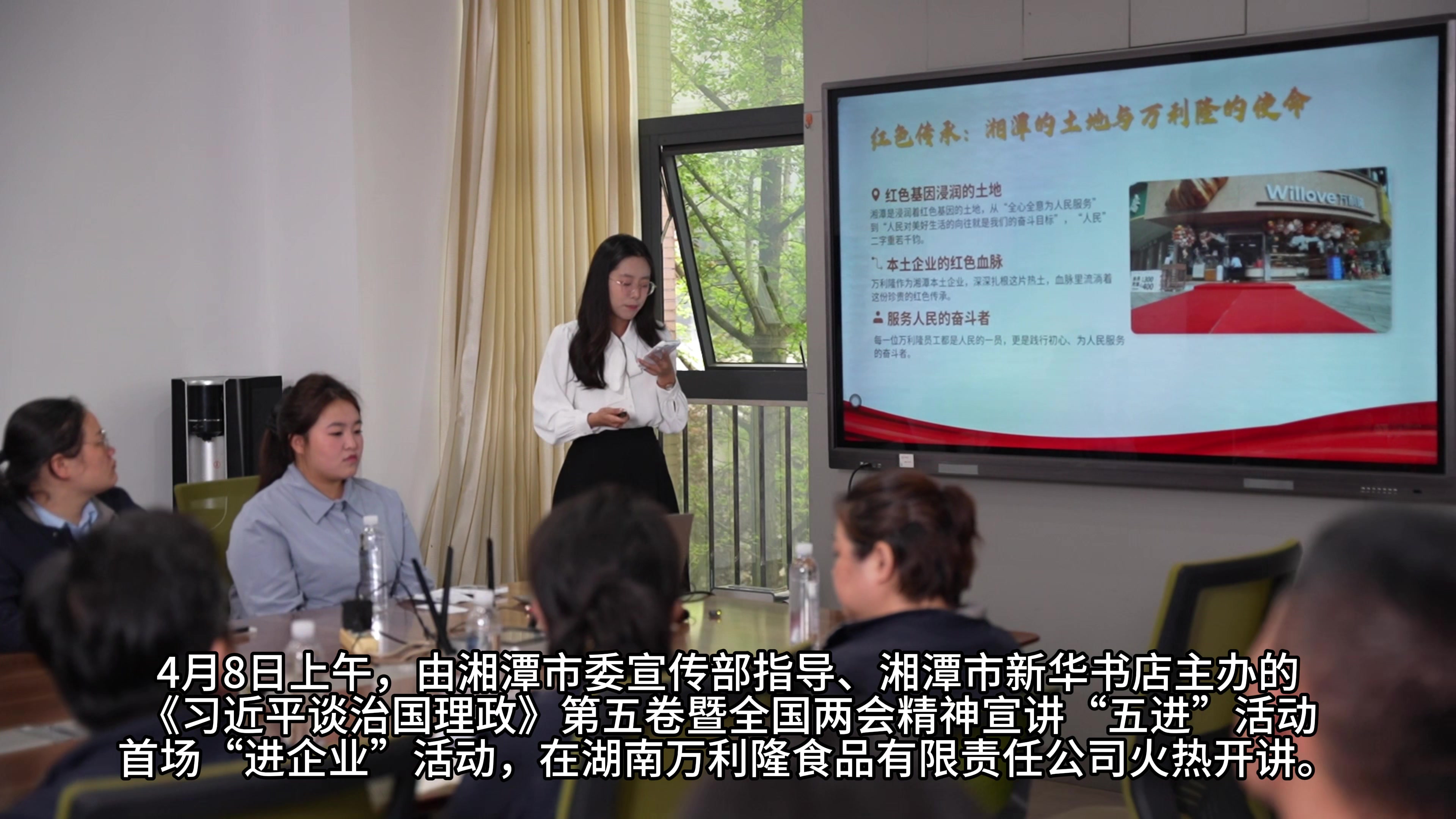 红网时刻新闻4月8日湘潭讯(记者 王兴夏 凌雨晴 楚湟 李乐怡 实习生 言雨桐)4月8日上午,由湘潭市委宣传部指导、湘潭市新华书店主办、红网湘潭站承办、湘大马院协办的《习近平谈治国理政》第五卷暨全国两会精神宣讲“五进”活动之“进企业”活动,在湖南万利隆食品有限责任公司的会议室里火热开讲。