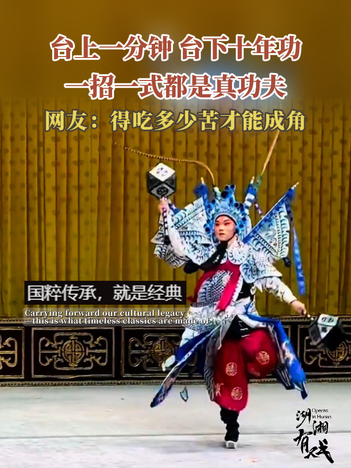 One minute on stage takes ten years of practice off stage. This collection of opera virtuosity—every frame is true skill, every glance tells a story. From hand gesture, eye movements, body posture and footwork to singing, recitation, acting and combat: each movement reveals mastery; every gesture carries the essence of tradition. What is breathtaking? What is heritage?This is the pride engraved in the bones of the Chinese people.
