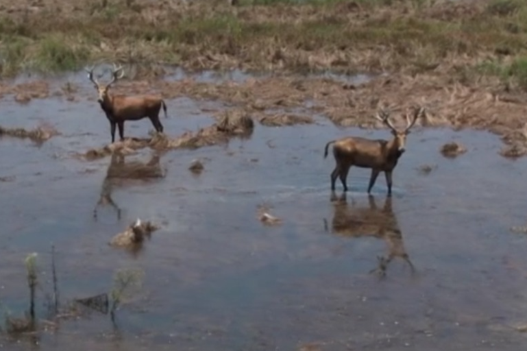 近日,湖南省益阳沅江市渔政执法人员例行巡护途中,在南洞庭湖漉湖水域发现两只国家一级保护动物麋鹿。它们身长2米,因其脸像马、角像鹿、蹄子像牛、尾像驴,故被称为“四不像”。