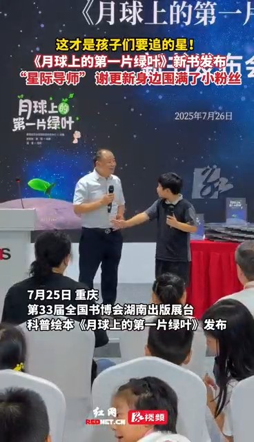 7月26日,第三十三届书博会(重庆)期间,湖南大学出版社策划出版的科普绘本《月球上的第一片绿叶》在湖南展馆举办新书首发式。现场互动环节,从月球的“蔬菜大棚”里该种什么、火星稀薄的大气层能否支持植物生长,到如何避免辐射对生物基因的影响…… 科学家与小读者如同技术探讨般交流,说到激动处,双方都“手舞足蹈”起来。