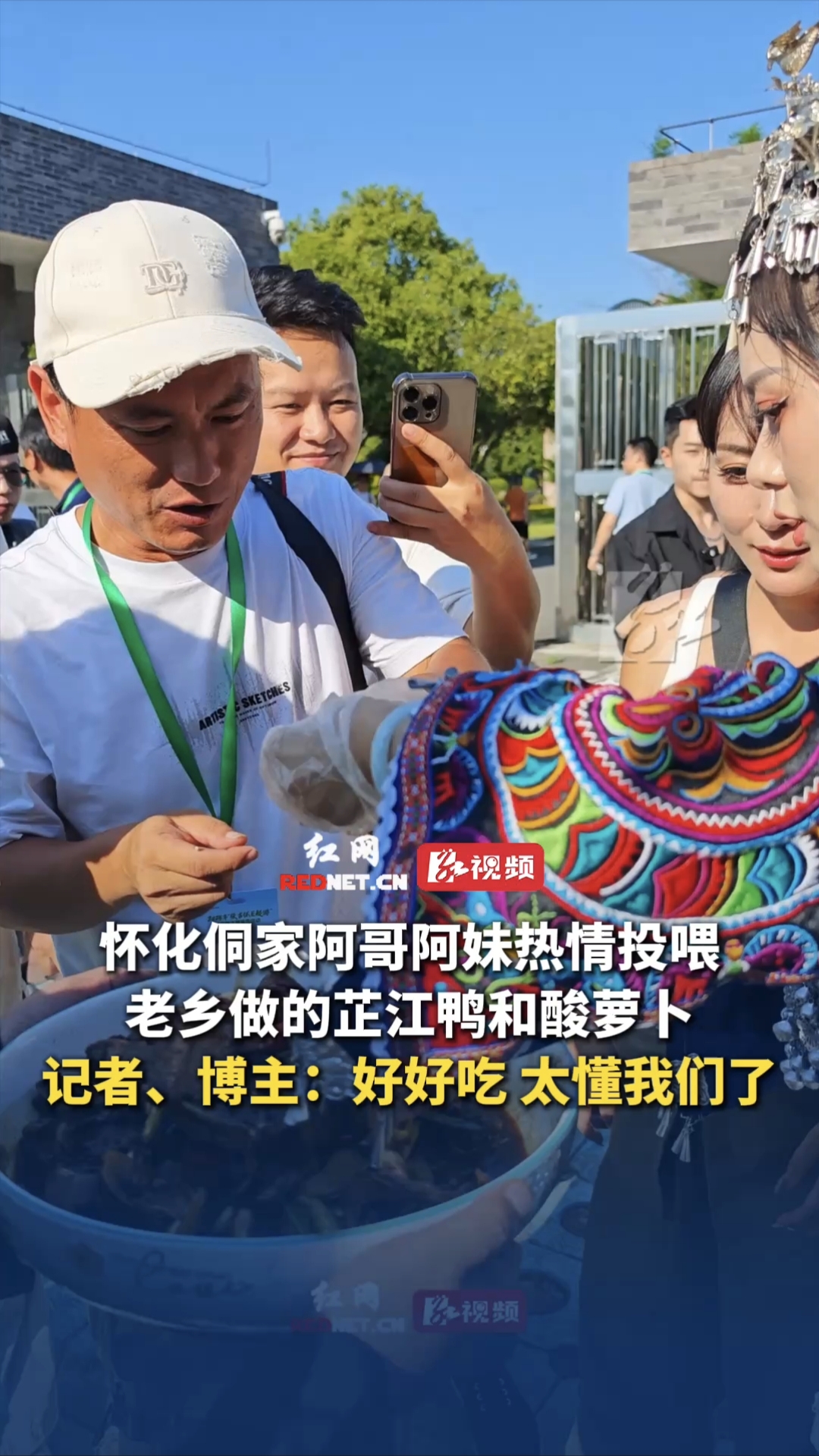 刚一抵达,访客们便被芷江人民扑面而来的盛情所包围。身着靓丽侗族服饰的阿哥阿妹们,早已端着热气腾腾、香气四溢的芷江本地名菜——芷江鸭,以及色泽诱人、酸爽开胃的芷江酸萝卜等候着。这份极具地方特色的“投喂”,立刻引发现场嘉宾惊喜的欢呼,大家纷纷迫不及待地品尝起来。