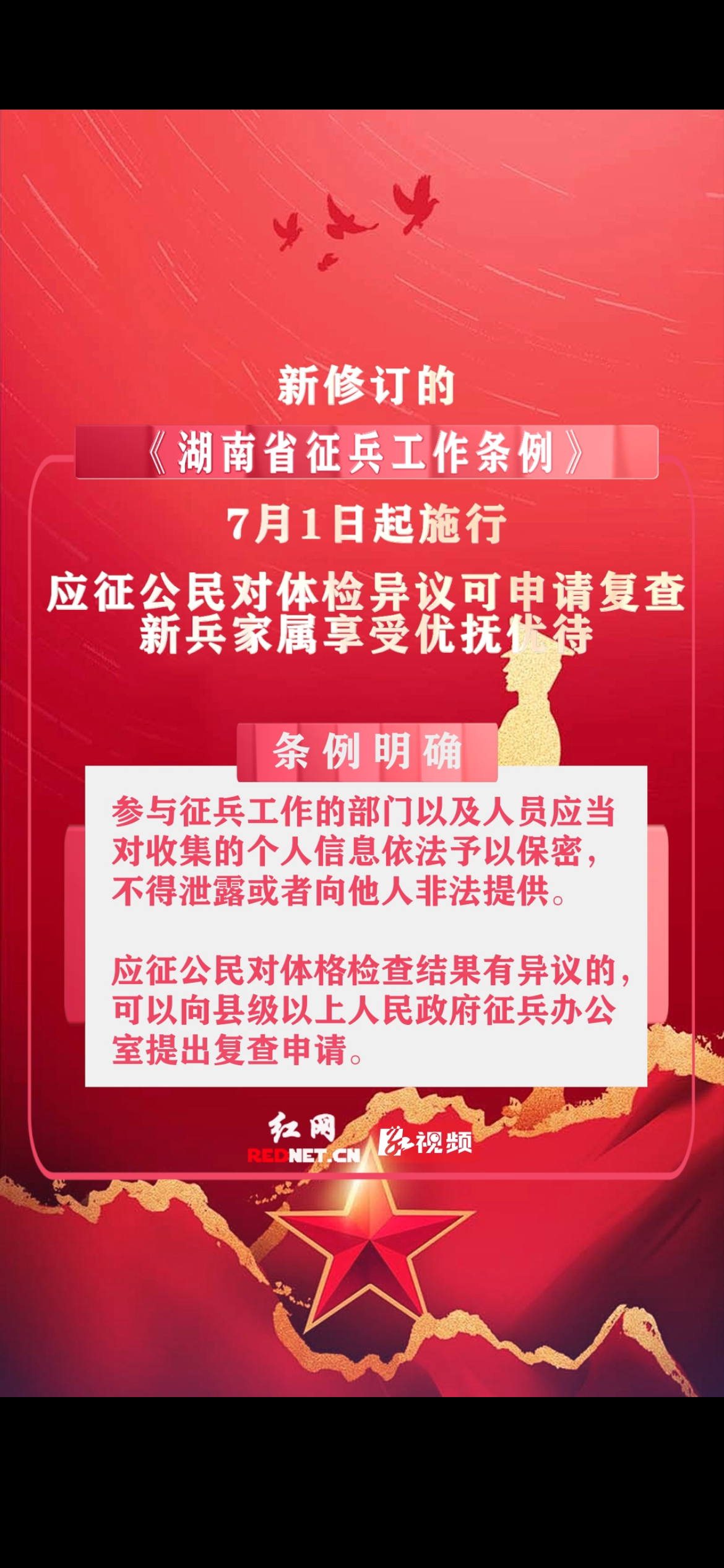 红网时刻新闻7月1日讯(记者 刘容 陈霸 曾妍)7月1日起,新修订的《湖南省征兵工作条例》施行。条例明确,参与征兵工作的部门以及人员应当对收集的个人信息依法予以保密,不得泄露或者向他人非法提供;应征公民对体格检查结果有异议的,可以向县级以上人民政府征兵办公室提出复查申请。条例规定,新兵自批准入伍之日起,按照规定享受现役军人待遇保障。新兵家属享受义务兵家庭优待金和法律法规规定的其他优待保障。