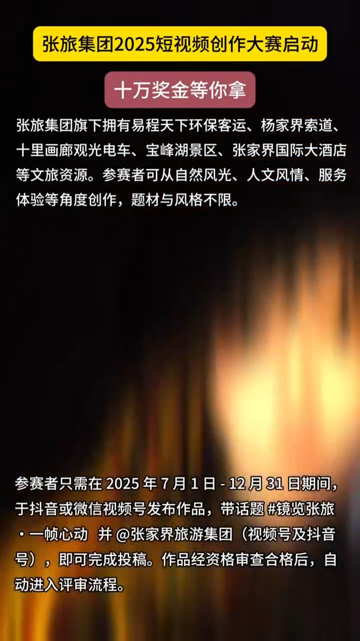 为深度挖掘张家界文旅资源的视觉魅力,张旅集团7月1日正式发布“镜览张旅・一帧心动”2025年度短视频创作大赛方案,面向社会各界征集聚焦旗下景区及服务的原创短视频作品。大赛设置总价值超10万元奖励,最高奖项达 3 万元,旨在以短视频为媒介,向全球展示张家界自然风光与人文服务的独特魅力。