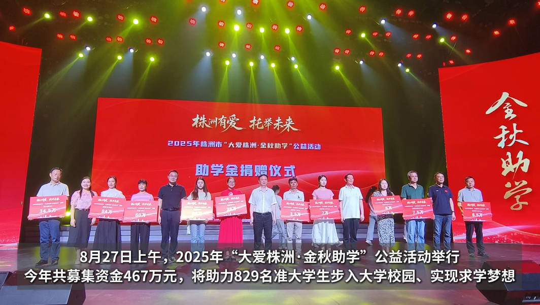 红网时刻新闻8月27日株洲讯(记者 苏莉雅 实习生 戴佳丽 廖嘉欣 通讯员 肖红)8月27日上午,2025年“大爱株洲·金秋助学”公益活动举行。今年共募集资金467万元,将助力829名准大学生步入大学校园、实现求学梦想。株洲市委常委、市委秘书长杨英杰,株洲市人大常委会副主任、市总工会主席李余粮出席捐赠仪式。