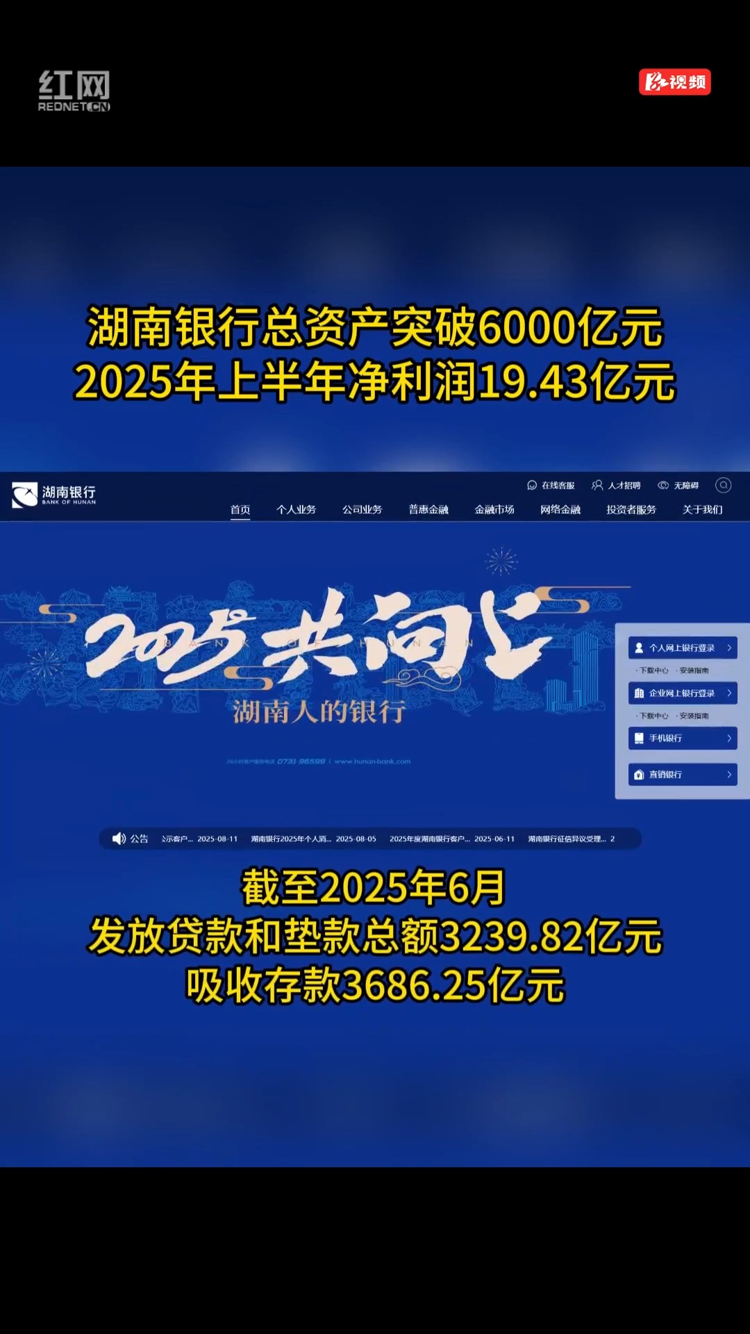红网时刻新闻8月21日讯(记者 肖娟)8月20日,湖南银行正式披露2025年半年度业绩报告。报告显示,该行资产规模稳步增长,总资产首次突破6000亿元,达6019.40亿元,经营效益保持稳健。