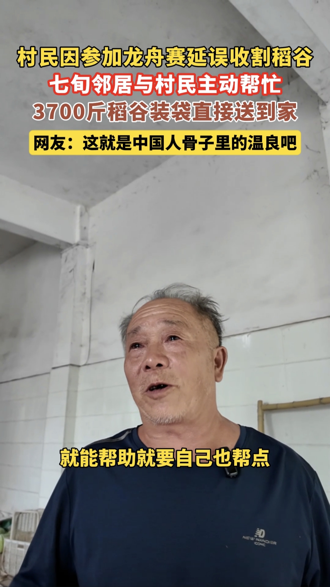 当刘生平比赛结束匆匆赶回时,等待他的不是亟待抢收的稻田,而是邻居们满满当当堆放在门口的谷袋。“真的不知道说什么好,太感谢了……”这个在龙舟桨板上毫不含糊的汉子,此刻声音有些哽咽。同样哽咽的,还有刘恩炎,“生平家里的老父亲已经80多岁了,都是邻居,能帮的必须尽力帮。”
