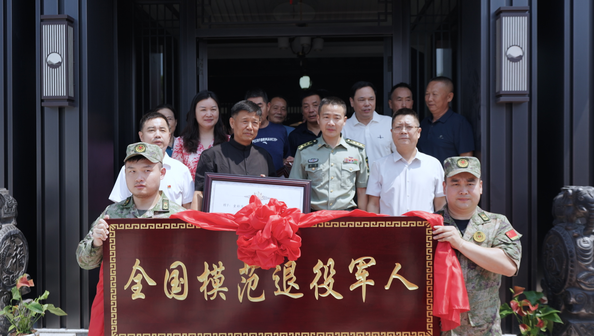 红网时刻新闻8月3日讯(通讯员 矜凰)八一军旗红,故里传佳讯。近日,在湖南省桃源县陬市镇鸬鹚洲村,一场简朴而隆重的送喜仪式正在举行。桃源县委常委、县人武部政委周军,桃源县退役军人事务局局长肖劲洲一行,将“全国模范退役军人”荣誉牌匾送至金煌家装集团董事长童彬原家中。这份殊荣,见证着这位退役老兵二十余载不改初心的家国情怀。