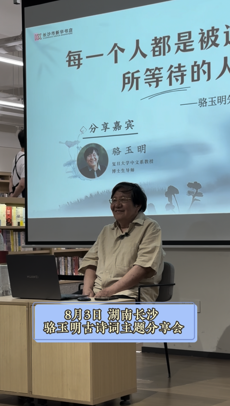 8月3日下午,“每一个人都是被这个世界所等待的人”骆玉明古诗词主题分享会在长沙举行。复旦大学中文系教授、文学史专家骆玉明现身新华书店·大剧院店,围绕“中国古诗形式的流变与美感”主题展开分享,为现场读者带来一场趣味横生的诗词盛宴。