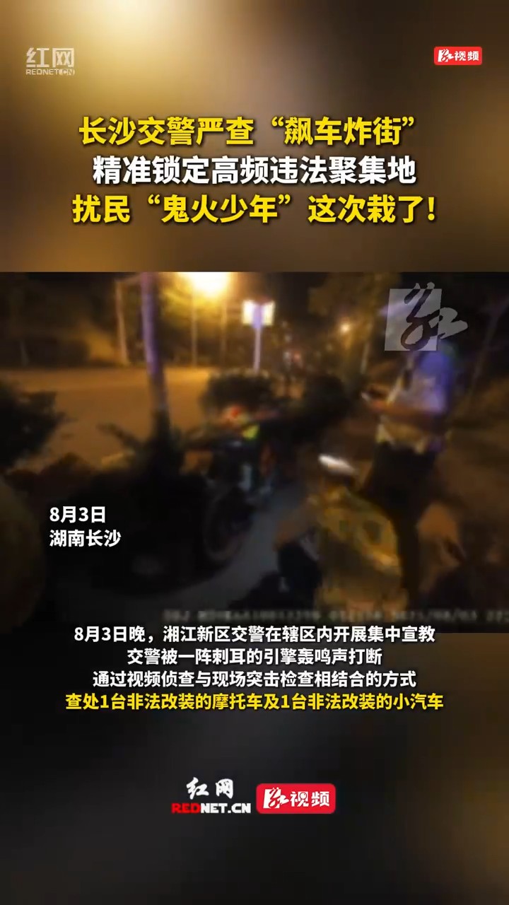 同样,8月3日晚20时许,湘江新区交警组织20余名精干警力对噪音扰民高频违法聚集地开展集中宣教活动。其间,宣教活动被一阵刺耳的引擎轰鸣声打断。交警立即反应,通过视频侦查与现场突击检查相结合的方式,共查处1台非法改装的摩托车及1台非法改装的小汽车。