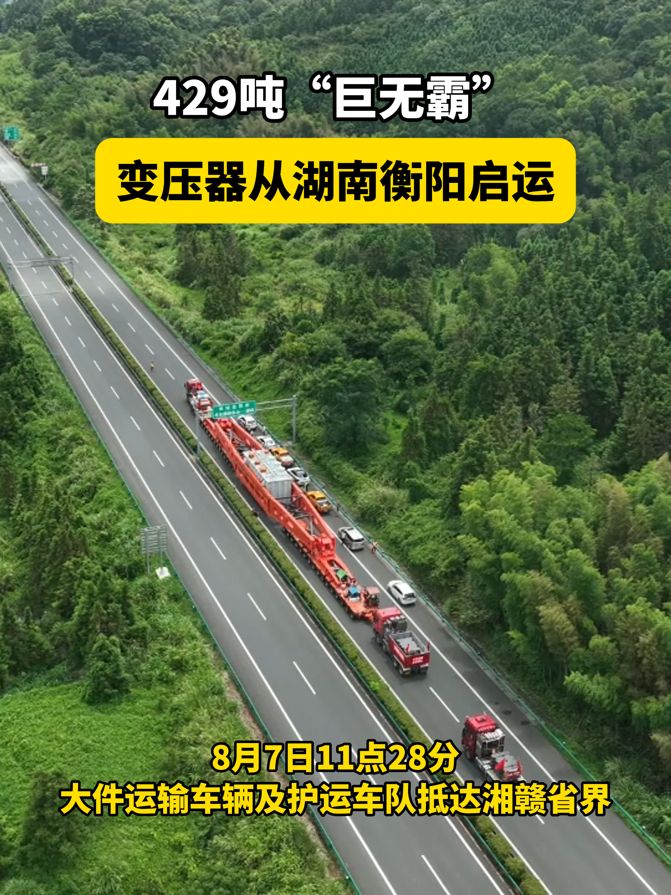 8月6日,一台重达429吨的大型变压器从湖南衡阳出发运往江西上饶发电厂。8月7日11点28分,大件运输车辆及护运车队抵达湘赣省界。运输“巨无霸”变压器的车体长92.15米 、宽5.13米、 高4.95米,在湘运输历时1.5天,途径多个高速路段,在湘运输路线里程为167公里。