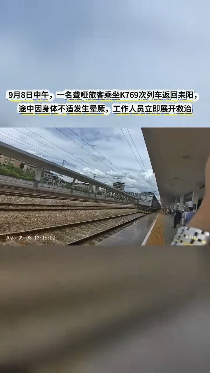 据了解,该旅客姓刘,是一名聋哑人,独自一人乘坐K769次列车从长沙回耒阳老家,因自身身体原因突然在车上昏迷,幸好得到及时救治,目前旅客已经清醒,身体状态良好。