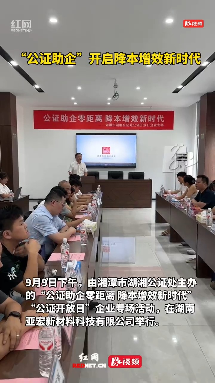 红网时刻新闻9月9日湘潭讯(记者 吴佳俊 通讯员 阮丹华)9月9日下午,由湘潭市湖湘公证处主办的“公证助企零距离 降本增效新时代”公证开放日企业专场活动,在湖南亚宏新材料科技有限公司举行。来自企业、银行的代表及公证处工作人员共20余人参加。