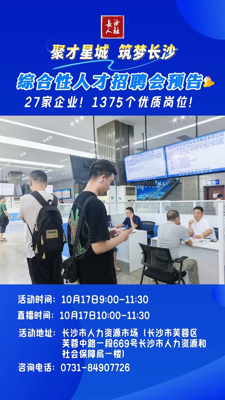 红网时刻新闻10月16日讯(记者 余雅琴)金秋十月,求职正当时!10月17日上午9点至11点半,一场汇聚27家优质企业、1375个就业岗位的综合性人才招聘会将在长沙市人力资源市场拉开帷幕。不仅有湖南红太阳光电、瑞邦管业等本地名企现场揽才,更创新推出“直播带岗” 环节,让求职者与企业“云上见面”、实时互动,找工作也能如此“潮”!无论是现场投递简历,还是线上围观提问,这里都有属于你的机会!职海扬帆,不负韶华——这场秋日里的“职”通车,等你上车!