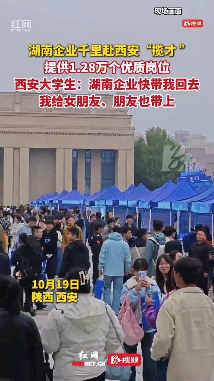 红网时刻新闻10月19日讯(记者 蒋利君 任晔 龚子杰 杨怡晴 李兵)10月19日,“智汇潇湘 才聚湖南”专场招聘会(西安站)在西安交通大学举行,湖南企业千里赴西安“揽才”,提供1.28万个优质岗位;西安大学生:湖南企业快带我回去,我把女朋友、朋友也带上。