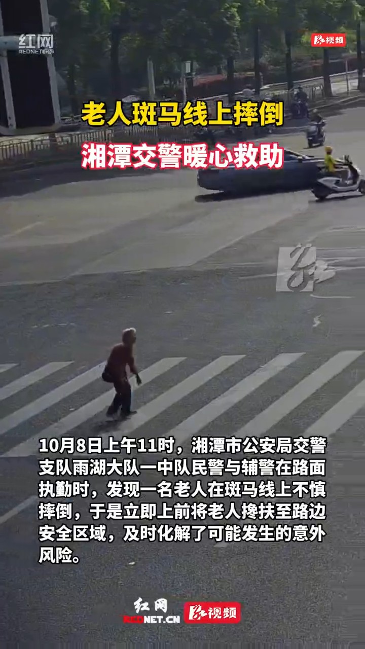 红网时刻新闻10月14日湘潭讯(记者 吴佳俊 通讯员 胡红章 邹斯怡)10月8日上午11时,湘潭市公安局交警支队雨湖大队一中队民警与辅警在路面执勤时,突然发现一名老人在红绿灯路口的斑马线上不慎摔倒,于是立即上前,小心将老人搀扶至路边安全区域。在沟通过程中,老人情绪骤然激动,试图冲向附近桥边,现场情况一度十分危急。