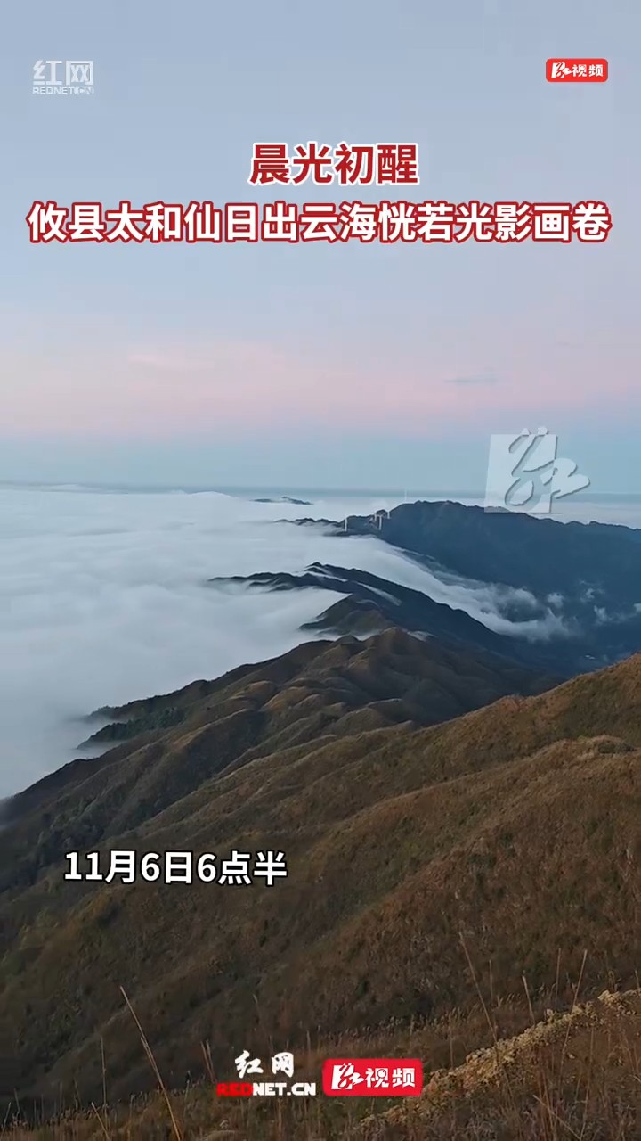 云海翻滚。太阳在天际中露出一角。太和仙远景。太阳露出地平线。太和仙的植被。红霞染满天际。云海与太阳形成美景。红网时刻新闻11月12日讯(记者 颜洪 通讯员 彭泽南 彭斯婷)山藏鸾峰秀,云隐太和仙。11月6日晨光初醒,攸县鸾山镇太和仙还笼在青黛色薄雾里,山脊线蜿蜒如龙,浮在翻涌的云海之上。天际由靛青渐变成金红刺破云层,为整座山脉镀上流动的金边。连绵的远山在晨光中显露出黛色剪影,霞光如胭脂在云朵间晕染开来。