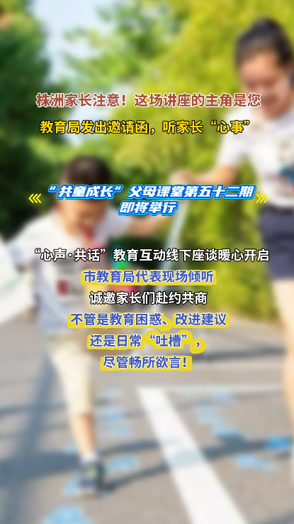红网时刻新闻11月26日株洲讯(记者 苏莉雅 通讯员 张旸怡雪)株洲家长朋友们,机会来了!11月28日(本周五)晚上,以“陪伴”为主题的株洲市“共童成长”父母课堂第五十二期将在株洲市芦淞区栗树山小学多媒体厅举行。此次父母课堂将重磅加场:不仅是课堂,更是专属于家长的“心声·共话”互动座谈——您积攒的教育困惑、想提的改进建议,或是那些不吐不快的日常小吐槽,这次都有市教育局代表现场认真倾听,精准接招!家校同心搭起沟通桥,让陪伴更有力量,本周五(11月28日)不见不散!